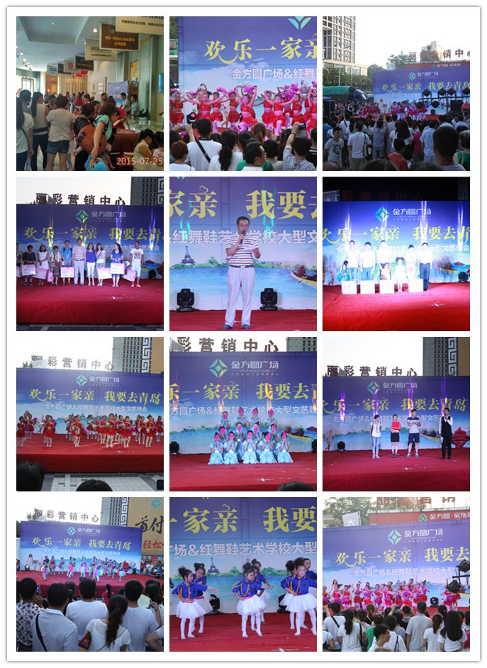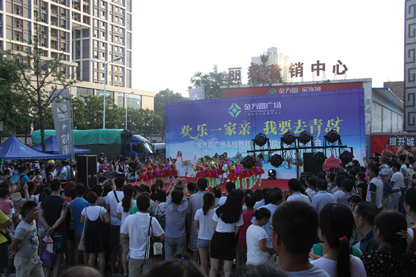 2015年7月25日晚,金方圆广场“欢乐一家亲 我要去青岛”大型文艺晚会在金方圆广场售楼部东侧广场举行。来自红舞鞋艺术学校的600多名小演员和家长们、参加“晒亲子秀 赢青岛游”微信投票互动的200多组家庭选手们,以及丽彩集团相关领导、媒体嘉宾齐聚一堂,热闹非凡,近1000人共同度过了一个难忘的金方圆广场之夜。