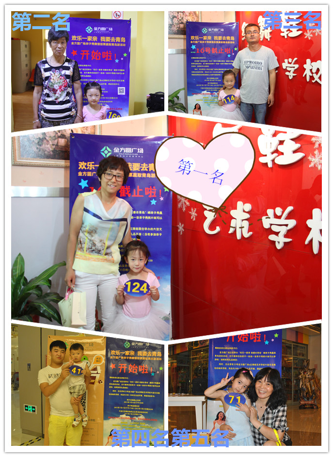 “欢乐一家亲 我要去青岛”金方圆广场晒亲子秀赢青岛游活动6月底开始筹备,7月出正式启动。本次活动分为三个阶段,第一阶段是7月10日-7月17日为亲子秀征集阶段,7天的照片征集,报名的家庭选手众多,而迫于微信后台投票选手人数限制,最终231组家庭选手参加了此次投票互动;第二个阶段是7月17日-7月25日亲子秀投票阶段,7月17日下午5点启动投票平台,不完全统计7月18日下午5点就有4000余人参与投票,截止到25号晚8:50投票平台关闭,参与此次微信投票互动的粉丝达11000多人,票数上300票的家庭选手就有十二组,而第一名与第二名在最初的前六天粉丝比拼中都不相上下,最后两天,第一名124号家庭选手势如破竹,一马当先,截止投票平台关闭票数达到1408票,遥遥领先于第二名160号家庭选手1058票,青岛游大奖也尘埃落定,实至名归。第三个阶段则是7月25日晚大型文艺晚会,近千人共襄盛举,共同见证了难忘的金方圆广场之夜。